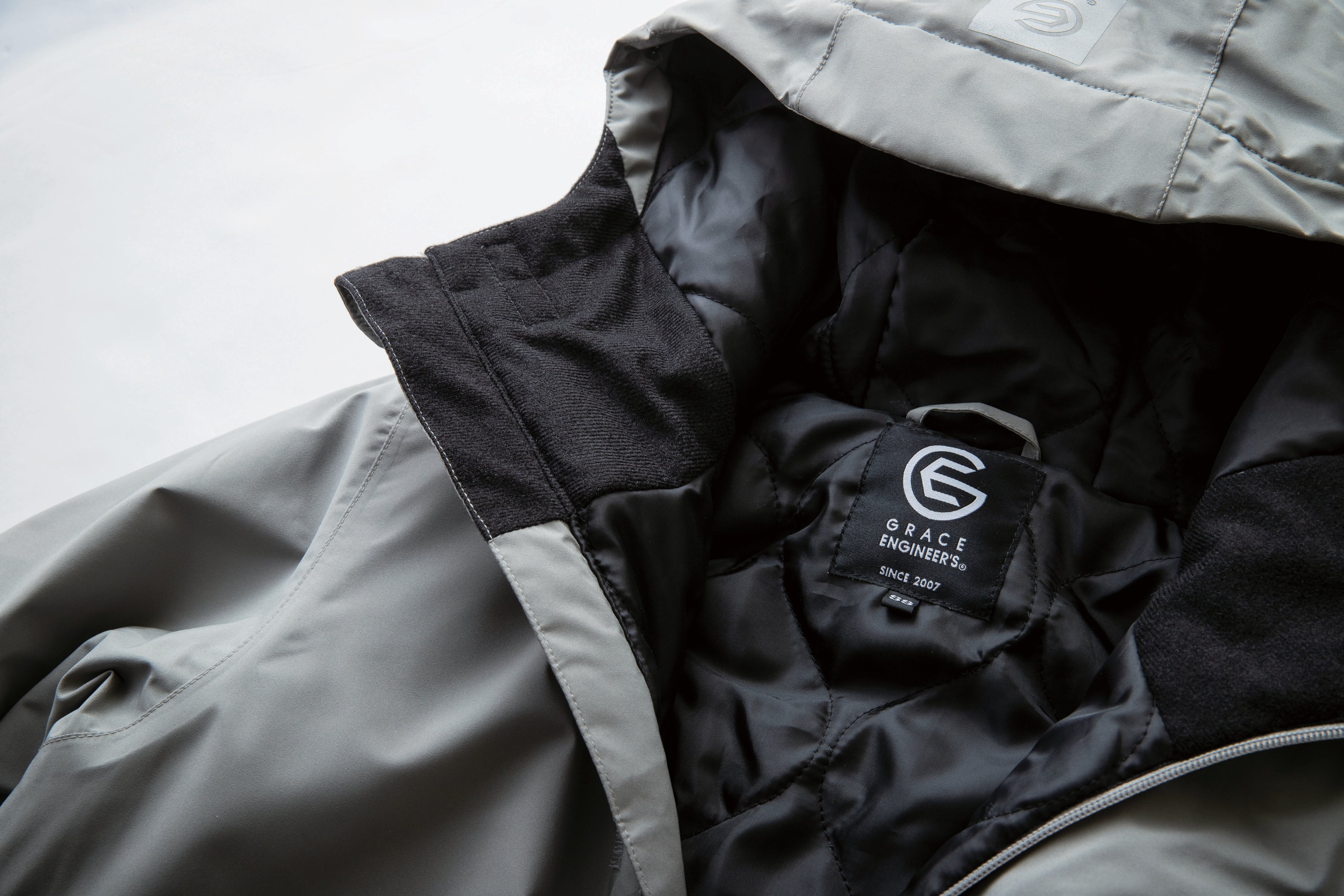 グレースエンジニアーズで不動の人気のブリザードシェルツナギの良さをそのまま踏襲した防風で防水な防寒ジャケットです。同シリーズのサロペット(GE-750)とセットアップで着た時にバランスのよいサイズ感なのもツナギメーカーならではのこだわりです。